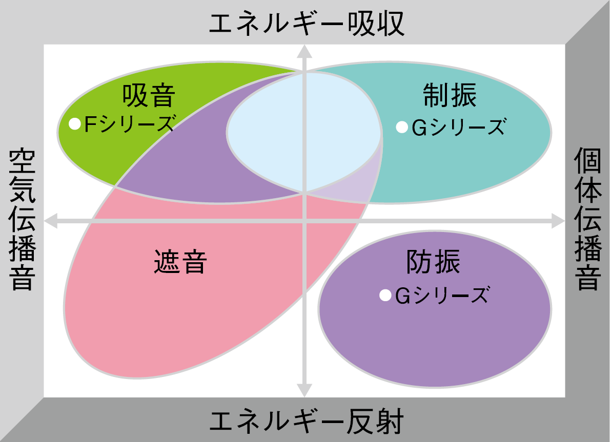 音源・伝播対策の両面で威力を発揮します。また、製品の素材によって防振・制振・吸音・遮音のそれぞれに対応します。